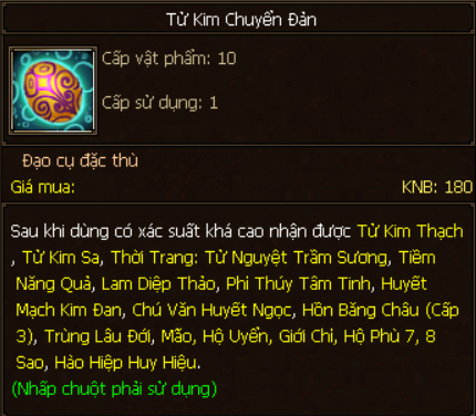 Ngoài ra bằng hữu có cơ hội nhận được: Tử Kim Thạch, Tử Kim Sa, Tiềm Năng Quả, Lam Diệp Thảo, Phỉ Thúy Tâm Tinh, Nguyên Chú Kim Phù, Tiềm Năng Quả, Lam Diệp Thảo, Trùng Lâu Đới, Mão, Hộ Uyển, Giới Chỉ, Hộ Phù 7 - 8 sao.,...
